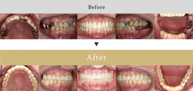 前歯の見た目や奥歯の欠損が気になっているとのことでご来院されました。当院からは、前歯の見た目を良くする審美セラミックとインプラント治療をご提案いたしました。インプラントを埋入することで、これまで奥歯がないことで抱えていた悩みが解消されたと非常にご満足いただけました。
