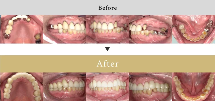 歯がなかった下顎の奥歯にはインプラントが入りしっかりと噛めるようになりました。さらに見た目が悪かった前歯部も審美的に美しい補綴治療を行うことで、大幅に口腔内が改善されました。