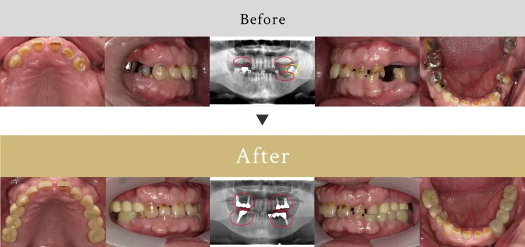 これまで歯がほとんど残っていない状態でしたが、奥歯にインプラントを埋入し、上下の歯がしっかりと噛み合うように咬合再構成を行ったため、見た目はもちろん機能的にも大幅に改善することができました。