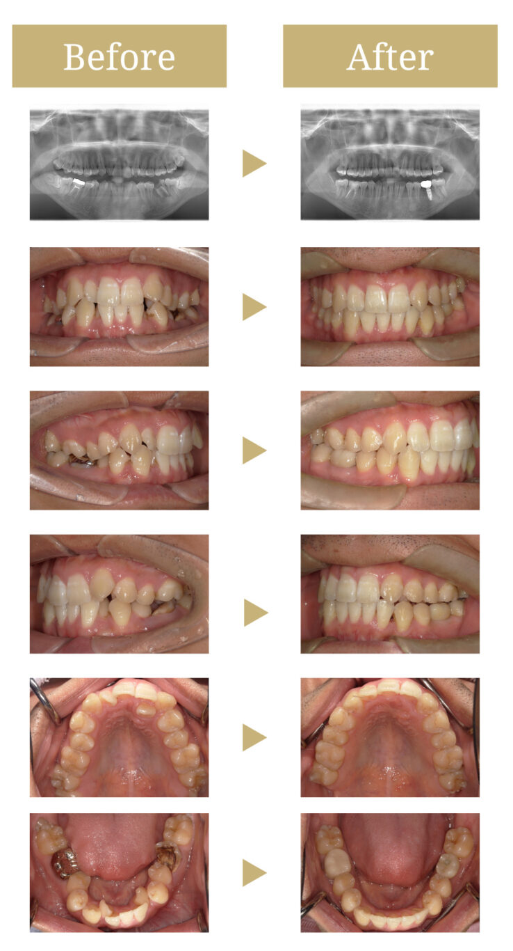 保存不可の歯があることや、歯列不正が大きい現状の状態を伝え、矯正とインプラントを併用した治療が長期的にはベストな治療内容と説明させていただきました。